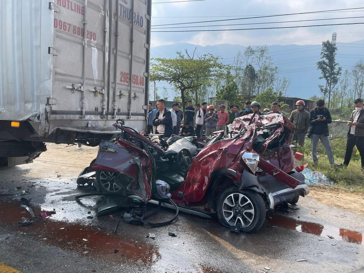 4 ô tô liên quan tới vụ TNGT liên hoàn gồm xe container mang BKS 99C – 077.53 kéo theo rơ-moóc 98RM – 035.53; xe ô tô con BKS 38A – 580.97; xe ô tô tải BKS 29E – 350.40 và xe ô tô khách BKS 17B – 012.66.